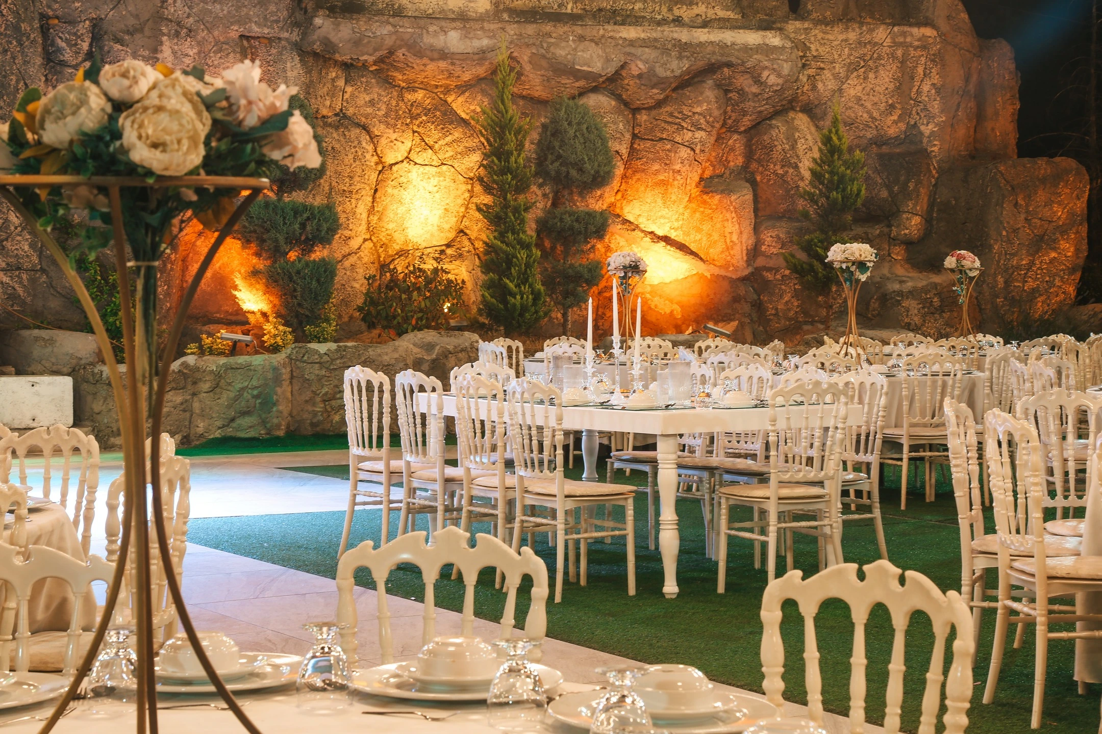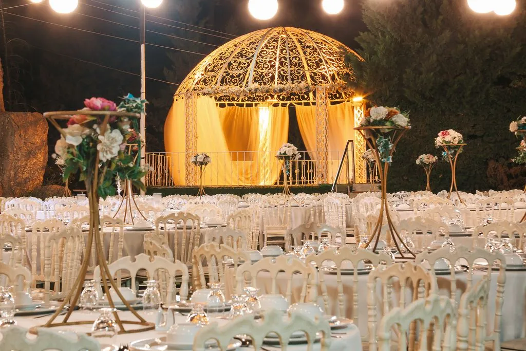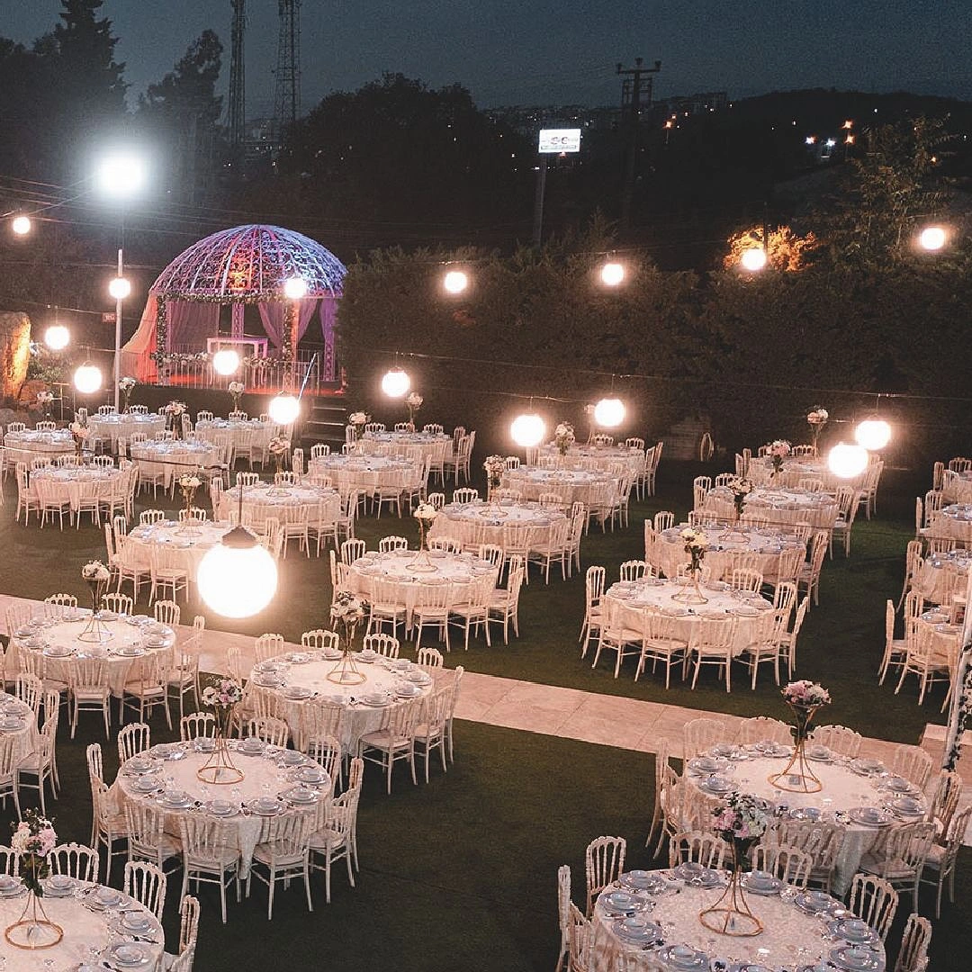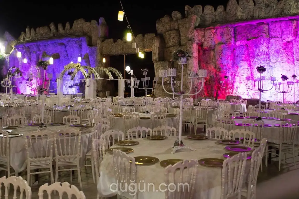 Kır bahçesi, romantik bir atmosfer yaratmak için özenle dekore edilmiş. Bahçede yapay şelale, çiçeklerle süslenmiş giriş takları ve gelin-damat gazebosu bulunuyor. Gazebolar tüllerle çevrilmiş ve büyük kubbeli yapısıyla göz alıcı bir alan sunuyor. Salon düğünleri ise modern ve şık dekorasyonu ile misafirlere konforlu bir deneyim sağlıyor. Yuvarlak masalar ve Napolyon sandalyelerle oturma düzeni tamamlanıyor.